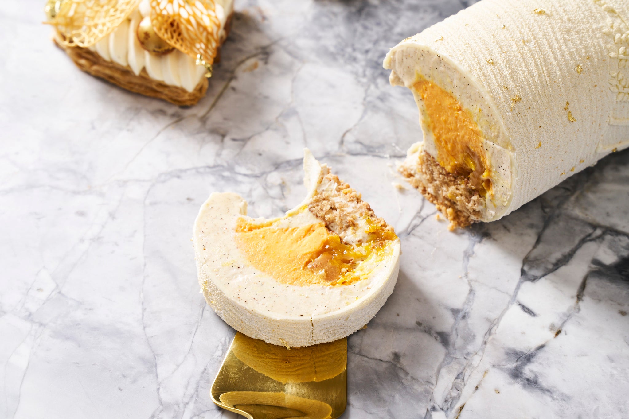 A contemporary take on the traditional Yule Log, The Christmas Wave celebrates the season’s most enchanting flavours. Layers of gingerbread cake meet the brightness of orange crèmeux and citrus marmalade, elevated by the crunch of almond crisp and a smooth orange caramel. Finished with a light whipped spiced ganache, delicately infused with ginger, vanilla, and tonka bean, this golden creation captures the warmth and wonder of the holidays with a hint to Australian seasonal freshness.